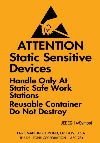 Text: Attention Static Sensitive Devices Handle Only At Static Safe Work Stations, Reusable Container Do Not Destroy, JEDEC-14/Symbol