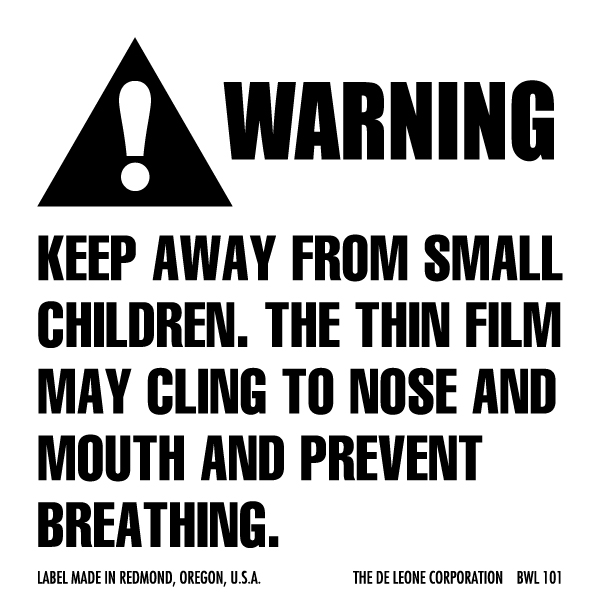 Text: Warning! Keep away from small children. The film may cling to nose and mouth and prevent breathing