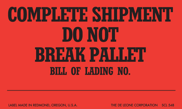 Text: Complete Shipment Do Not Break Pallet Bill of Lading No. ____