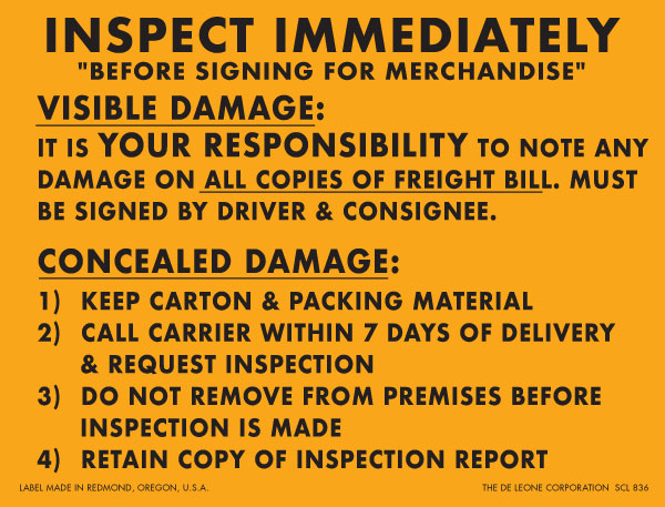 Text: Inspect Immediately Before Signing For Merchandise, Visible Damage…, Concealed Damage…