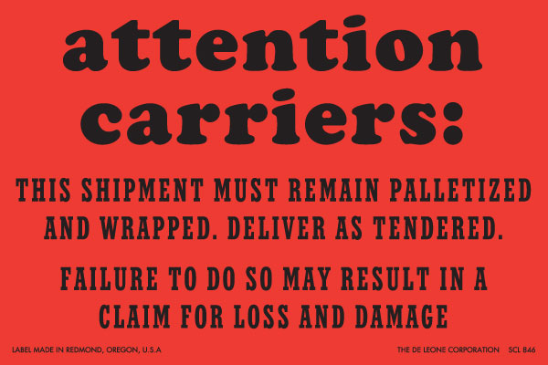 Text: Attention Carriers: This Shipment Must Remain Palletized And Wrapped. Deliver As Tendered. Failure To Do So May Result In A Claim For Loss And Damage