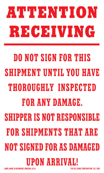 Text: Attention Receiving Do Not Sign For This Shipment Until You Have Thoroughly Inspected For Any Damage. Shipper Is Not Responsible For Shipments That Are Not Signed For As Damaged Upon Arrival!
